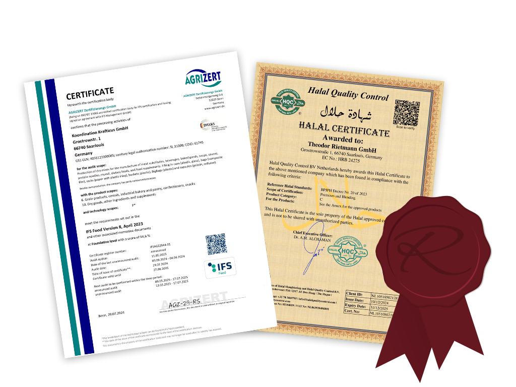 Seit vielen Jahren erfüllen wir in unserer Produktion internationale Standards. Die jährlichen IFS-Zertifizierungen sowie Zertifizierungen im Halal- und Bio-Bereich sind längst eine Selbstverständlichkeit.